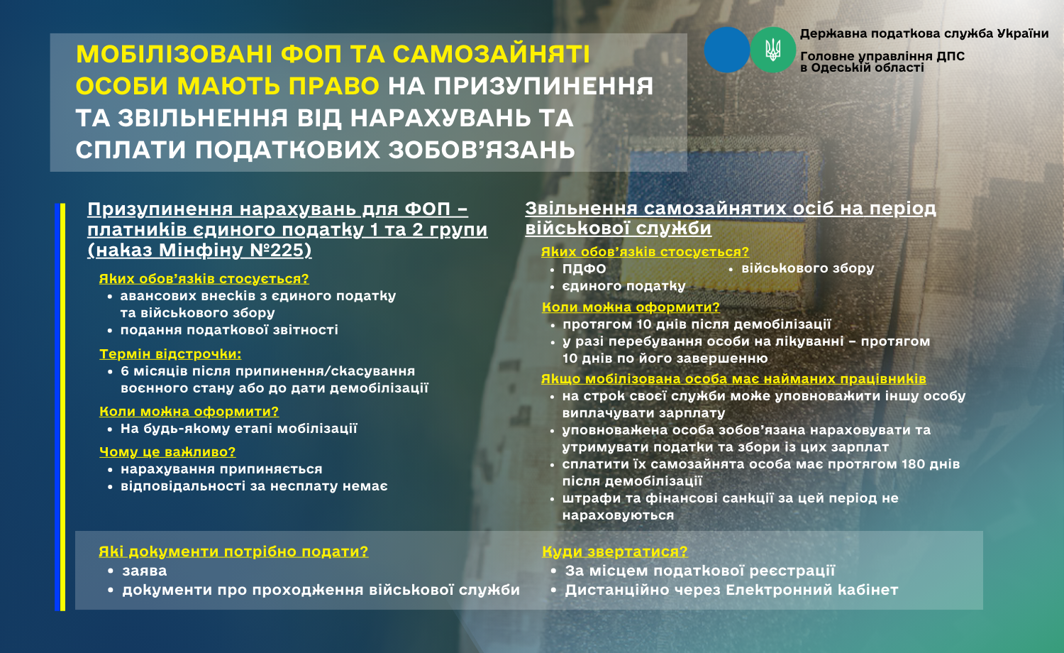 До уваги мобілізованих платників податків – фізичних осіб – підприємців першої та другої групи єдиного податку, які не можуть виконувати податкові обов’язки, чи членам їхніх родин!