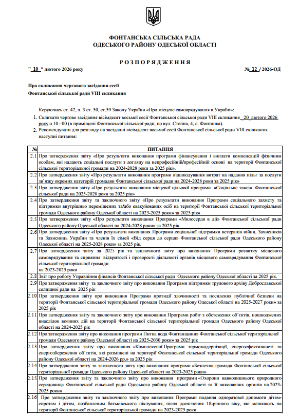 Про скликання чергового засідання сесії Фонтанської сільської ради VIII скликання Posted on 10.02.2026Author rada fontanska Р О З П О Р Я Д Ж Е Н Н Я від 10 лютого 2026 року № 12/ 2026-ОД