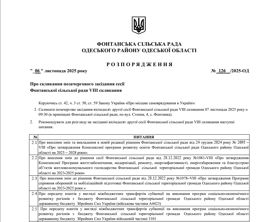 Про скликання позачергового засідання сесії Фонтанської сільської ради VIII скликання Posted on 06.11.202506.11.2025Author rada fontanska Р О З П О Р Я Д Ж Е Н Н Я від “06 ” листопада 2025 року №126/2025-ОД “Про скликання позачергового засідання сесії Фонтанської сільської ради VIII скликання”