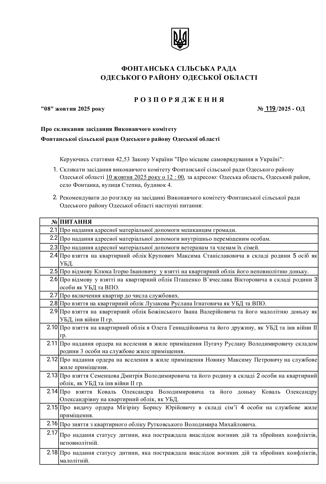 Щодо скликання засідання виконавчого комітету Фонтанської сільської ради Posted on 08.10.2025Author rada fontanska
