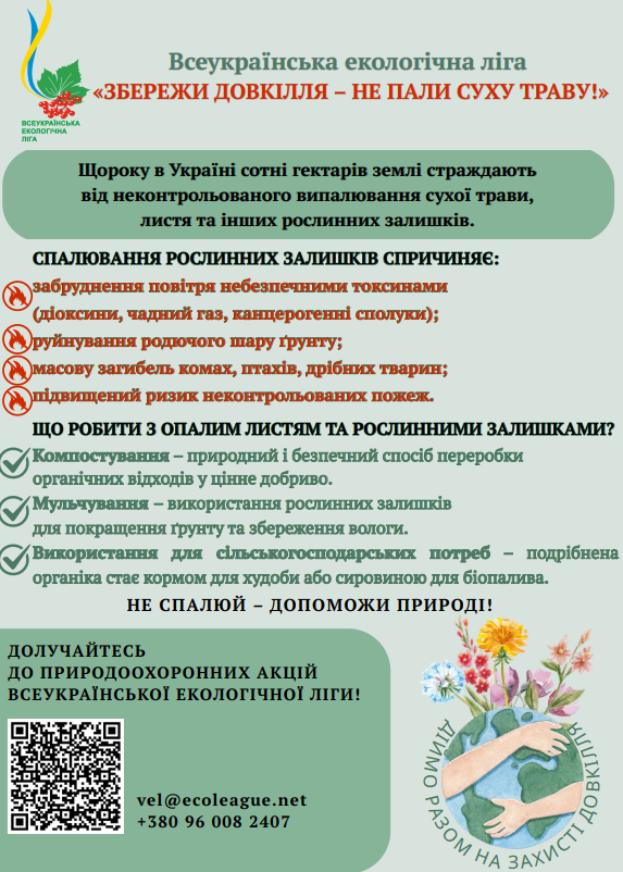 ВЕЛ розпочинає всеукраїнську природоохоронну акцію «Збережи довкілля – не пали суху траву». Метою акції є привернення уваги громадськості до небезпеки спалювання сухої трави, листя та інших рослинних залишків, а також популяризація екологічно безпечних способів їх утилізації.